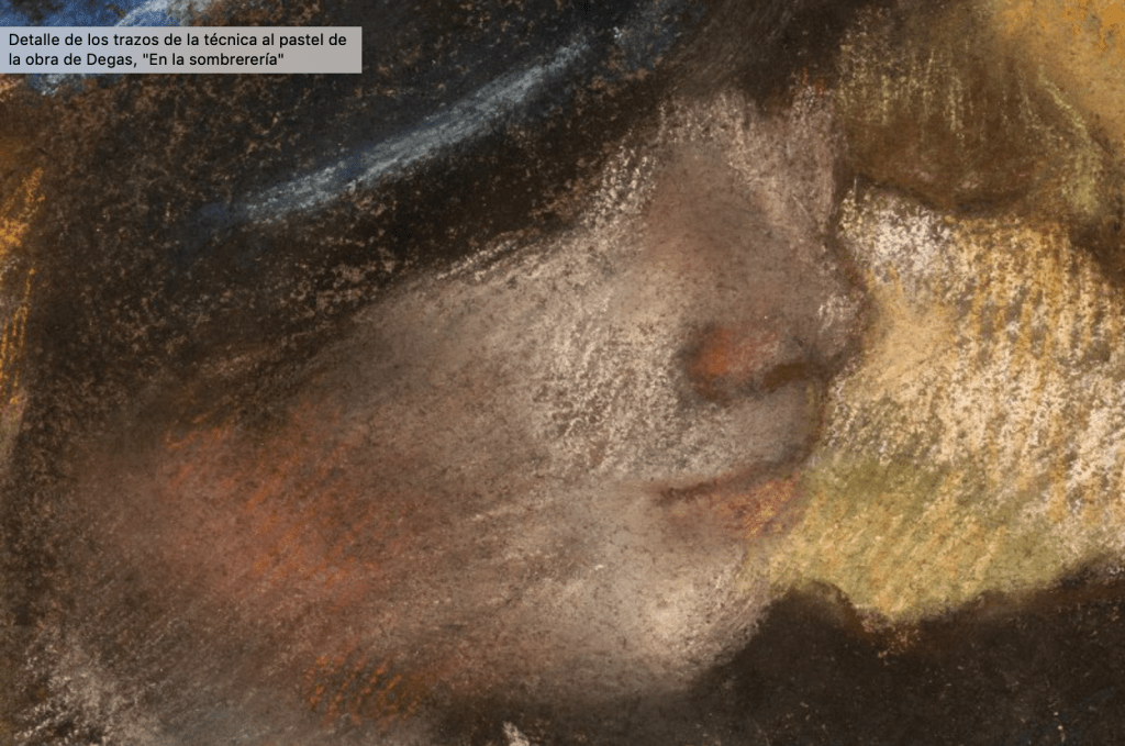 La exposición gira en torno al pastel En la sombrerería (1882), una pieza de extraordinaria fragilidad y complejidad técnica que ha sido objeto de un profundo estudio durante más de un año, gracias al mecenazgo de la Fundación María Cristina Masaveu Peterson. Este proyecto ha permitido desvelar los materiales y procedimientos empleados por Degas en la creación de la obra mediante tecnologías avanzadas como reflectografía infrarroja, radiografía, macrofotografía y análisis de laboratorio, proporcionando información valiosa sobre la técnica del artista y las mejores estrategias de conservación.