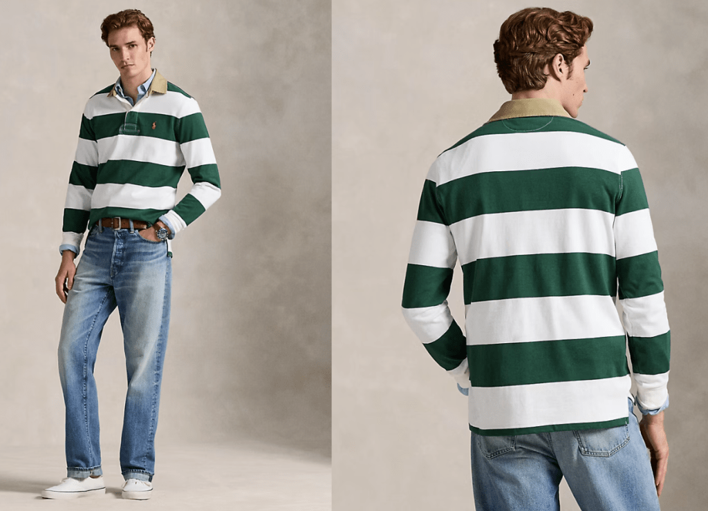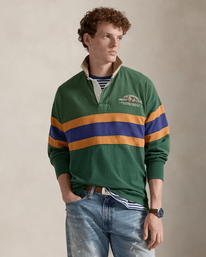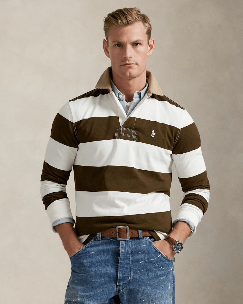 Este auge se refleja, entre otras referencias, en las propuestas de Ralph Lauren, donde las rayas horizontales en polos y camisas rugby se consolidan como piezas clave del vestuario masculino. Estas prendas, cargadas de herencia deportiva y sofisticación atemporal, ofrecen versatilidad sin perder presencia estilística.